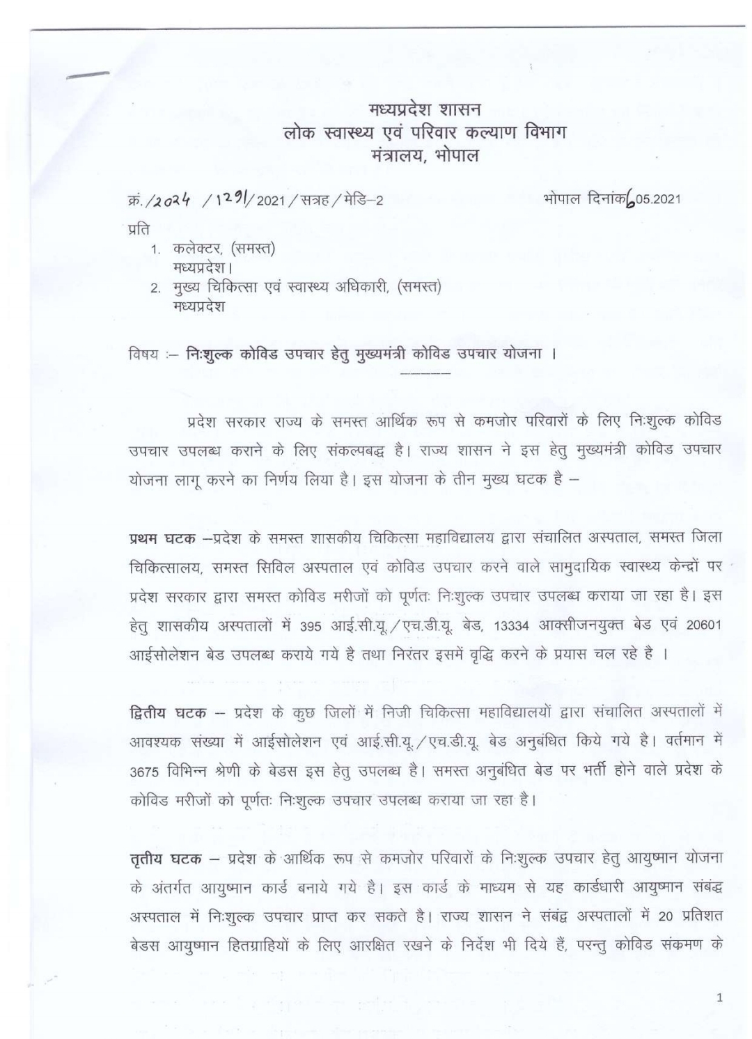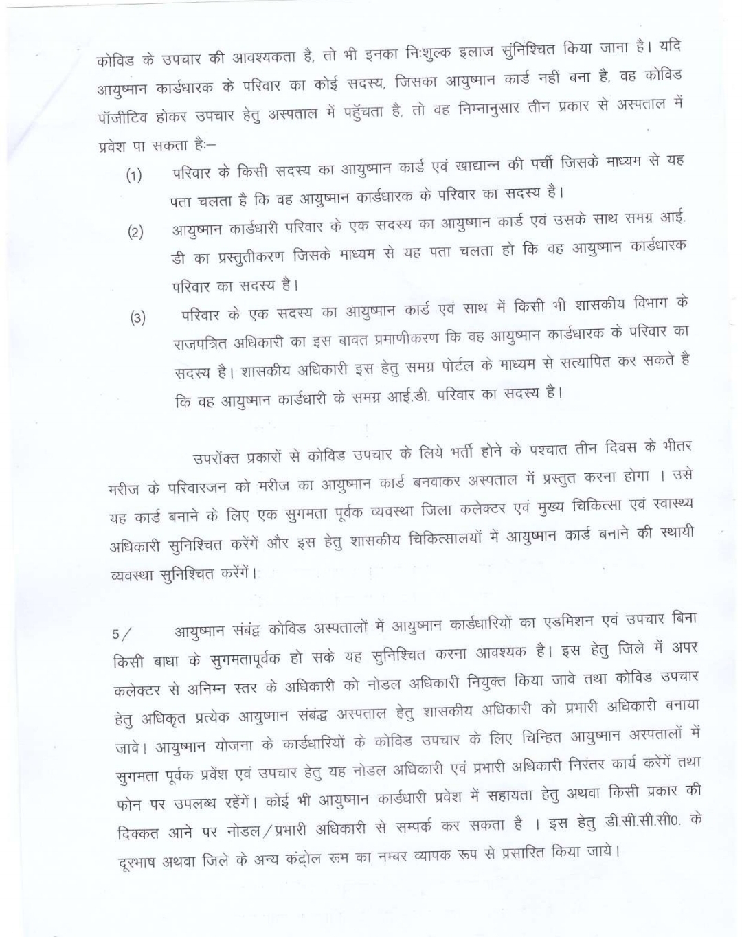 प्रत्येक जिले के निजी अस्पतालों में नि:शुल्क इलाज मिल सके, इसके लिये कलेक्टर्स को अधिकार दिये गये हैं कि वे अपने जिले के निजी अस्पतालों को आयुष्मान भारत योजना के अंतर्गत अस्थाई रूप से संबद्ध कर सकेंगे। इससे इन सभी निजी अस्पतालों में, जहाँ वर्तमान में कोरोना का इलाज किया जा रहा है, आयुष्मान कार्ड धारियों को कोरोना का नि:शुल्क इलाज मिल सकेगा।