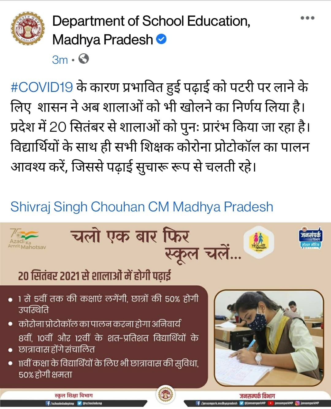 देवास 14 सितम्बर 2021/ प्रदेश के सभी शासकीय और अशासकीय विद्यालयों में कक्षा पहली से पाँचवी तक की प्राथमिक स्तर की कक्षाएँ 50% क्षमता के साथ 20 सितंबर से संचालित हो सकेगी। उप सचिव, स्कूल शिक्षा विभाग श्री प्रमोद सिंह ने बताया कि मुख्यमंत्री श्री शिवराज सिंह चौहान के निर्देश और प्रदेश में कोविड-19 संक्रमण की परिस्थितियों को ध्यान में रखकर यह निर्णय लिया गया है। श्री सिंह ने बताया कि कक्षा आठवीं, दसवीं और बारहवीं के शत-प्रतिशत विद्यार्थियों के लिए छात्रावास और आवासीय विद्यालय संचालित किए जायेंगे। कक्षा 11वीं के विद्यार्थियों के लिए भी स्कूल और छात्रावास खोले जायेंगे, लेकिन छात्रावास में उनकी कुल क्षमता के 50 प्रतिशत से अधिक विद्यार्थी उपस्थित नहीं होंगे। विद्यालय और छात्रावास में अभिभावकों की सहमति से ही विद्यार्थी उपस्थित हो सकेंगे।