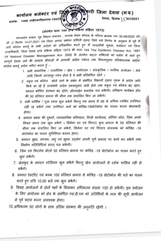 देवास, 15 जुलाई 2021/ कलेक्‍टर एवं जिला दण्डाधिकारी श्री चन्द्रमौली शुक्ला ने दण्ड प्रक्रिया संहिता 1973 की धारा 144 The Epidemic Disease Act, 1897 एवं National Disaster Management Act- 2005 के अंतर्गत प्रदत्त शक्तियों को प्रयोग में लाते हुए सम्पूर्ण देवास जिले की राजस्व सीमाओं में आगामी आदेश तक प्रतिबंधनात्‍मक आदेश/कोरोना कफ्र्यू आदेश जारी किये है।