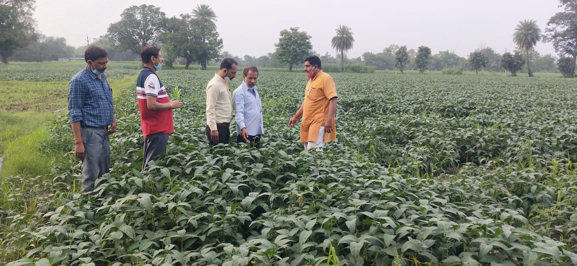 देवास. जिले में वर्तमान में सोयाबीन की फसल में तने की मक्खी, सेमीलूपर, तंबाकू की इल्ली, चने की इल्ली एवं रोगों का प्रकोप होने संबंधी जानकारी कृषकों के माध्यम से प्राप्त हो रही है, जिसको ध्यान में रखते हुए कृषि विज्ञान केन्द्र के प्रधान वैज्ञानिक एवं प्रमुख डॉ. ए. के. दीक्षित, शस्य वैज्ञानिक डॉ. महेन्द्र सिंह एवं कीट वैज्ञानिक डॉ. मनीष कुमार द्वारा लगातार देवास जिले के विकासखण्ड बागली के गांव राजौदा, बांगरदा, डबलचौकी, महूडि़या, करनावद, गुराडि़या, चापड़ा, मोफा पिपलिया, बेड़ामउ, पोलाय, बड़ी, कमलापुर इत्यादि एवं विकासखण्ड सोनकच्छ के डकाच्या, पोलायजागीर, नराना, चौबारा जागीर, जांमली, फावड़ा, जामगोद, खटम्बा एवं भौंरासा आदि गांवों में कृषकों के खेतों में सोयाबीन फसल का निरीक्षण किया गया।