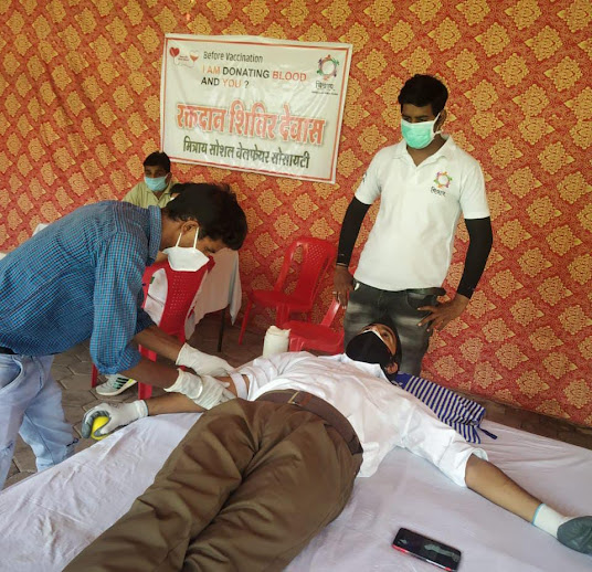 टीका लगवाने से पहले शिविर में युवाओं ने किया रक्तदान