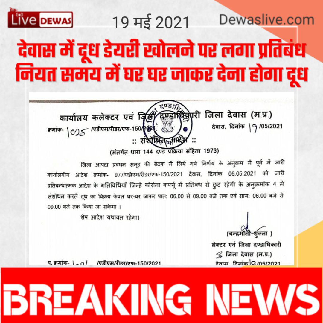 देवास जिले में कोरोना कर्फ्यू के दौरान दूध का विक्रय केवल घर-घर जाकर प्रात: 06 से 09 बजे तक एवं सायं: 06.00 बजे से 09.00 बजे तक किया जा सकेगा