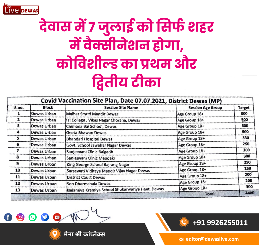 मुख्य चिकित्सा एवं स्वास्थ्य अधिकारी डॉ एमपी शर्मा ने बताया कि 7 जुलाई 2021 को केवल कोवीशील्ड वैक्सीन के सत्र केवल देवास शहरी क्षेत्र में 13 संस्थाओ पर आयोजित होंगे। जिसके अन्तर्गत कोवीशील्ड वैकसीन के प्रथम एवं द्वितीय डोज दिये जायेंगे। सत्र मल्हार स्मृति मंदिर देवास,आईटीआई कॉलेज, विकास नगर चोरहा, देवास, चिमना बाई स्कूल, देवास,गीता भवन देवास,भंडारी अस्पताल देवास,सरकारी स्कूल जवाहर नगर देवास,संजीवनी क्लिनिक बालगढ़,संजीवनी क्लिनिक मेंडकी, किंग जॉर्ज स्कूल बजरंग नगर, सरस्वती विद्या मंदिर विजय नगर देवास,जिला,न्यायालय देवास, सेन धर्मशाला देवास,इस्लामिया क्रमिया स्कूल शुक्रवरिया हाट, देवास में आयोजित होंगे।