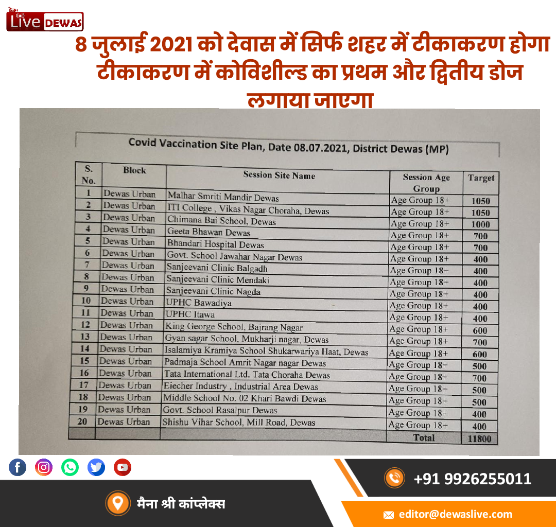 मुख्य चिकित्सा एवं स्वास्थ्य अधिकारी डॉ एमपी शर्मा ने बताया कि 8 जुलाई 2021 को केवल कोवीशील्ड वैक्सीन के सत्र केवल देवास शहरी क्षेत्र में 20 संस्थाओ पर आयोजित होंगे। जिसके अन्तर्गत कोवीशील्ड वैकसीन के प्रथम एवं द्वितीय डोज दिये जायेंगे। सत्र मल्हार स्मृति मंदिर ,देवास आईटीआई कॉलेज, विकास नगर चोराहा, देवास चिमानाबाई स्कूल, देवास गीता भवन देवास ,भंडारी अस्पताल देवास सरकारी, स्कूल जवाहर नगर देवास ,संजीवनी क्लिनिक बालगढ़ ,संजीवनी क्लिनिक मेंडकी ,संजीवनी क्लिनिक नागदा, यूपीएचसी बावड़िया ,यूपीएचसी इटावा ,किंग जॉर्ज स्कूल, बजरंग नगर ,ज्ञान सागर स्कूल, मुखर्जी नगर, देवास इसलामिया कर्मिया स्कूल शुक्रवरिया हाट, देवास पद्मजा स्कूल ,अमृत इंटरनेशनल नगर लिमिटेड देवास ,टाटा इंटरनेशनल नगर लिमिटेड टाटा चोराहा देवास ,आयशर इंडस्ट्री, इंडस्ट्रियल एरिया देवास, मिडिल स्कूल नंबर 02 खारी बावड़ी देवास, गवर्नमेंट स्कूल रसलपुर देवास शिशु विहार स्कूल, मिल रोड, देवास, में आयोजित होंगे।