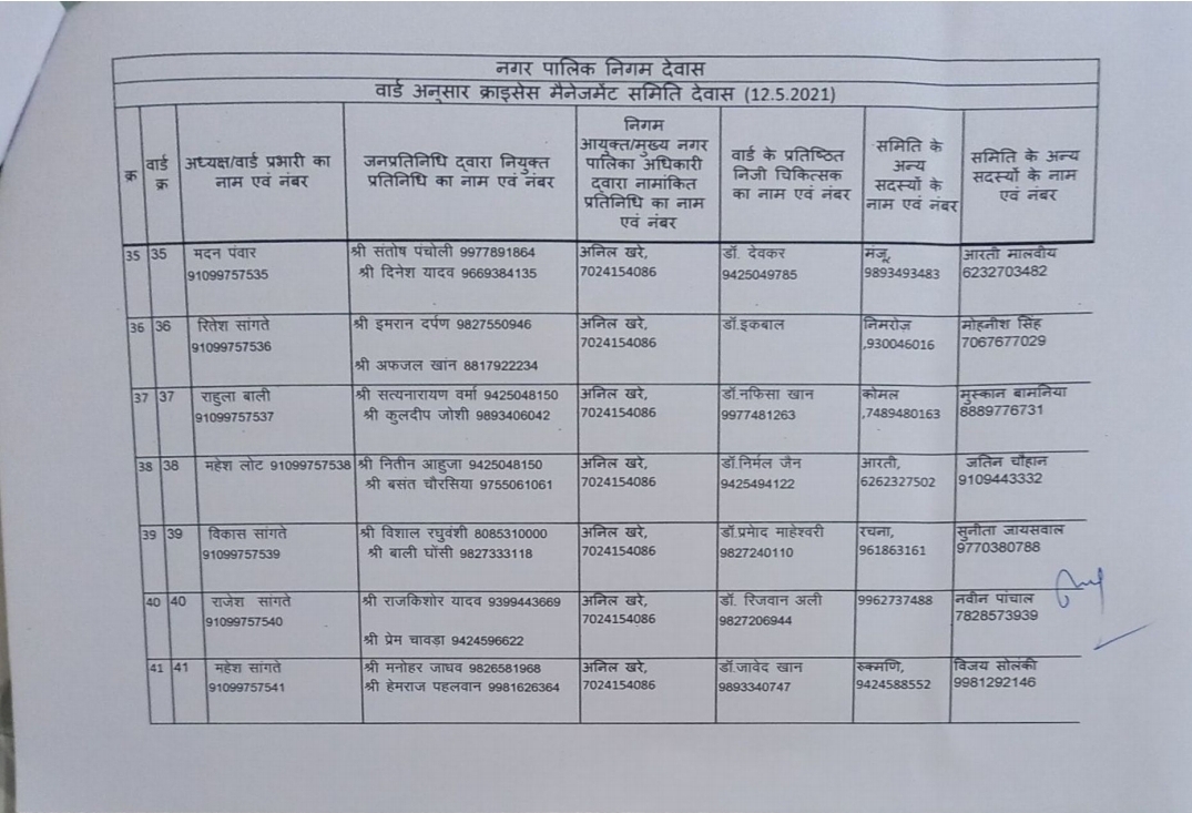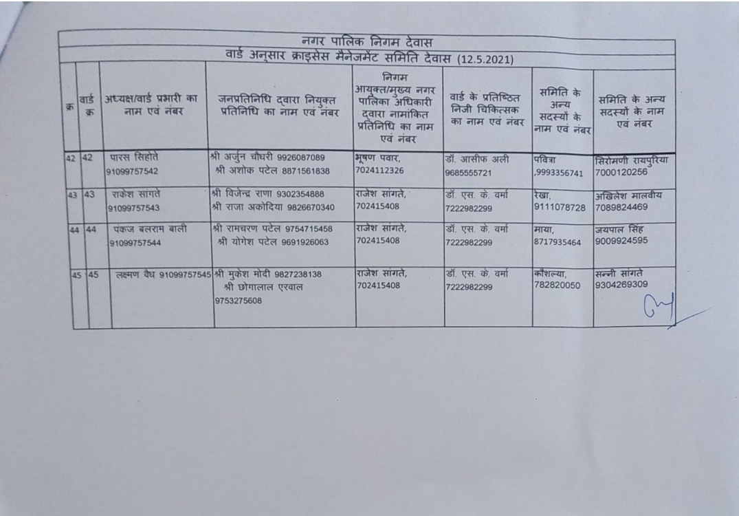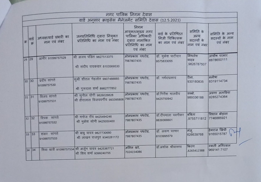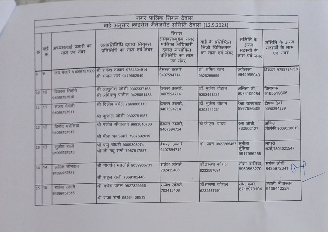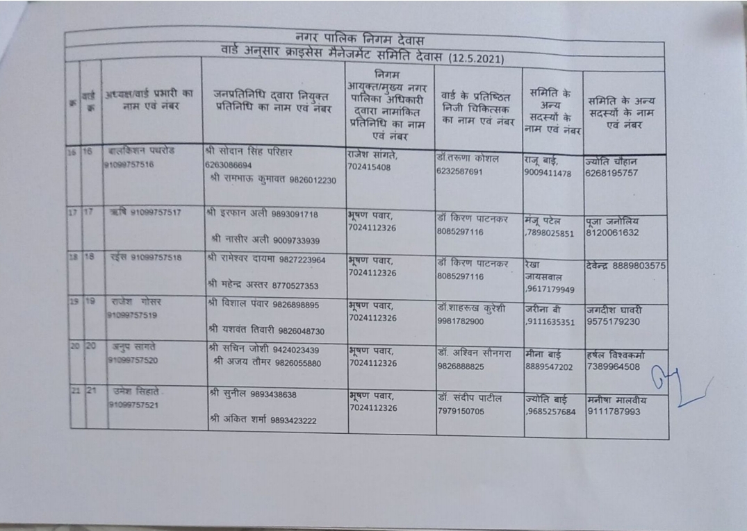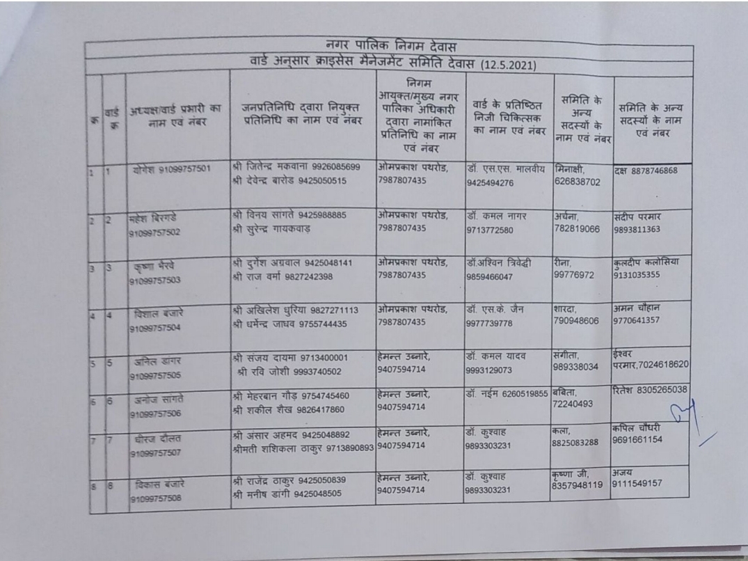 देवास लाइव। देवास शहर के 45 वार्डों में क्राइसिस मैनेजमेंट ग्रुप की स्थापना की गई है। इन ग्रुप में वार्ड के दो जनप्रतिनिधि द्वारा चयनित सदस्य, एक नगर निगम, एक वार्ड के चिकित्सक, दो अन्य सदस्य और नगर निगम द्वारा नियुक्त वार्ड प्रभारी होंगे।