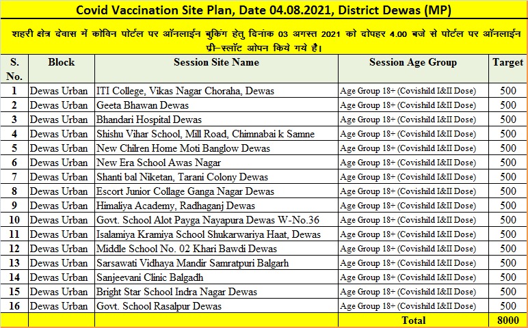 मुख्य चिकित्सा स्वास्थ्य अधिकारी डॉ एमपी शर्मा ने बताया कि देवास शहरी क्षेत्र मे 4 अगस्त 2021,को कोविड-19 टीकाकरण, के 16 सत्र  आयोजित होंगे।सभी सत्र में कोविशिल्ड वैक्सीन के पहला औरं दूसरा डोज लगाये जाएगे शहरी क्षेत्र देवास में कोविड-19 वैक्सीनेशन के 16  सत्र साइट का नाम,आईटीआई कॉलेज, विकास नगर चोराहा, देवास,गीता भवन देवास,भंडारी अस्पताल देवास,शिशु विहार स्कूल, मिल रोड, चिम्नाबाई के सामने ,न्यू चिलरेन होम मोती बंगलो देवास,न्यू एरा स्कूल आवास नगर,शांति बाल निकेतन, तारानी कॉलोनी देवास,एस्कॉर्ट जूनियर कोलाज गंगा नगर देवास,हिमालय अकादमी, राधागंज देवास,सरकारी,स्कूल आलोट पयगा नयापुरा देवास वार्ड-नंबर 36,इस्लामिया क्रमिया स्कूल शुक्रवरिया हाट, देवास, मध्य विद्यालय क्रमांक 02 खारी बावड़ी देवास,सरस्वती विद्या मंदिर सम्राटपुरी बालगढ़,संजीवनी,क्लिनिक बालगढ़,ब्राइट स्टार स्कूल इंद्र नगर देवास,सरकारी स्कूल रसलपुर देवास, जिला मुख्यालय ,नगर निगम क्षेत्र देवास में कोविड-19 टीकाकरण सत्रों का आयोजन, कोविन पोर्टल पर ऑनलाईन प्री-स्लॉट बुकिंग के माध्यम से ही किया जाएगा। इन सत्रो हेतु कोविन पोर्टल पर ऑनलाईन बुकिंग हेतु दिनांक 3 अगस्त 2021 को दोपहर 4.00 बजे से पोर्टल पर ऑनलाईन प्री-स्लॉट ओपन किये गये है।