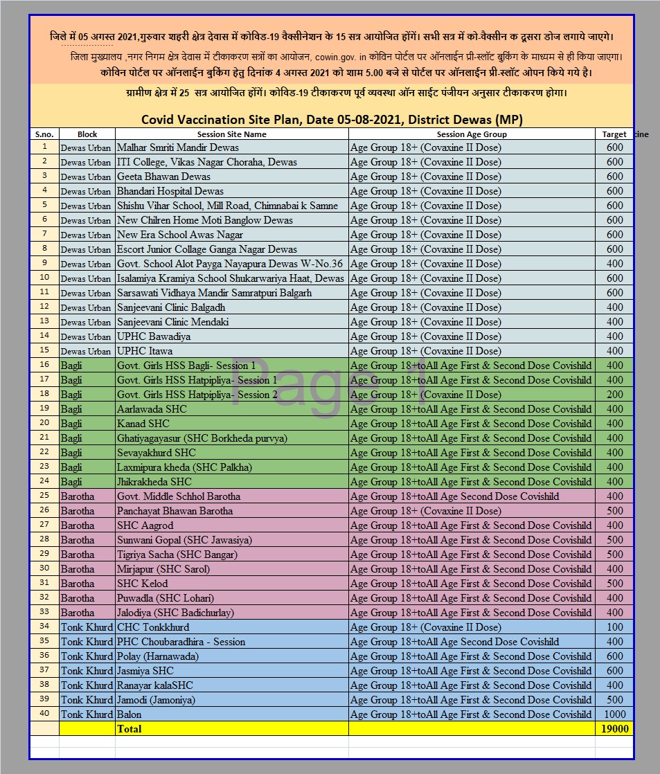 जिले में 05 अगस्त 2021,गुरूवार को 40 सत्रों आयोजित होंगे। शहरी क्षेत्र देवास में 15 और ग्रामीण क्षेत्र मे 25 सत्र लगेंगे।