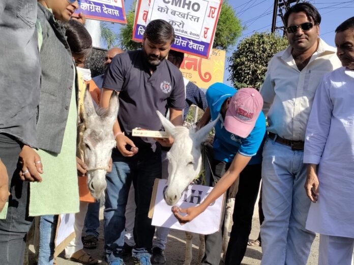 इसी तरह क्रम में आज स्थानीय भोपाल चौराहे पर देवास के सीएमएचओ की तख्ती लटका कर एक गधे को गुलाब जामुन खिलाए गए।