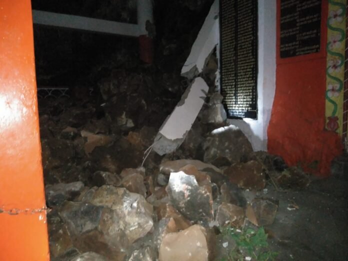देवास लाइव। मध्यप्रदेश के देवास (Dewas) स्थित प्रसिद्ध माता टेकरी पर मंगलवार की रात हादसा हो गया। मां तुलजा भवानी मंदिर के बगल में स्थित हनुमान मंदिर के पीछे पहाड़ दरक गया, जिससे मंदिर का एक पिलर टूट गया। घटना रात के समय होने से कोई जनहानि नहीं हुई। बताया जा रहा है टेकरी पर अंधाधुंध निर्माण कार्य, कंपन और पानी रिसने की वजह से पत्थर कमजोर हुए हैं।