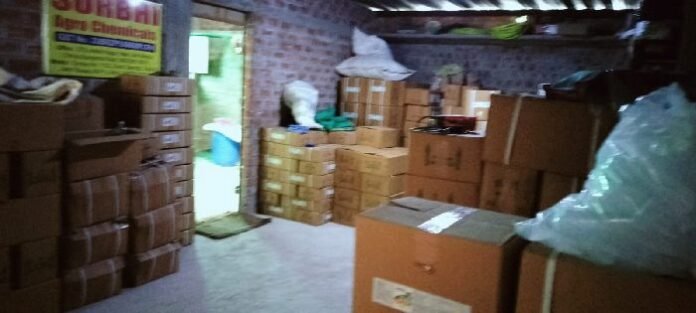 उप संचालक कृषि श्री आर.पी. कनेरिया ने बताया कि जिला स्तरीय गुण नियंत्रण दल ने सारोल रोड ग्राम सन्नोड में संचालित सुरभी एग्रो केमिकल्स का निरीक्षण किया। निरीक्षण के दौरान बिना अनुज्ञप्ति के पौध संरक्षण औषधी, ज्वाला क्लोरोपायरीफास 50 प्रति+सायपरमेथ्रिन 5 प्रति ईसी, लीडर प्रोफेनोफास 40 प्रति+सायपरमेथ्रिन 4 प्रति ईसी, ईमापावर ईमामेक्टिन बेन्जोएट 5 प्रति एसजी, धमाका ईमामेक्टिन बेन्जोएट 1.9 प्रति ईसी, सुपर स्टीकी वेटिंग एजेन्ट, सिलीग्रो एक्टीवेशन एजेन्ट, भरे ड्रम 10 नग, खाली ड्रम 20 नग, पैकिग मशीन, सीलीग मशीन, बद्दी मशीन कंपनी के लेबल इत्यादि सामग्री गोदाम में अवैध भंडारण एवं विनिर्माण पाये जाने से कीटनाशी अधिनियम 1968 के तहत प्रोपायटर गीतांजली पति मनोज साली पता 358 अशोक नगर इन्दौर एवं सुपरवाईजर श्री सतीश कनिक पिता एन.के. कनिक निवासी 520 बृजेश्वरी इन्दौर के विरूद्ध थाना बरोठा में प्रथम सूचना रिपोर्ट (एफ.आई.आर.) दर्ज की गई है।