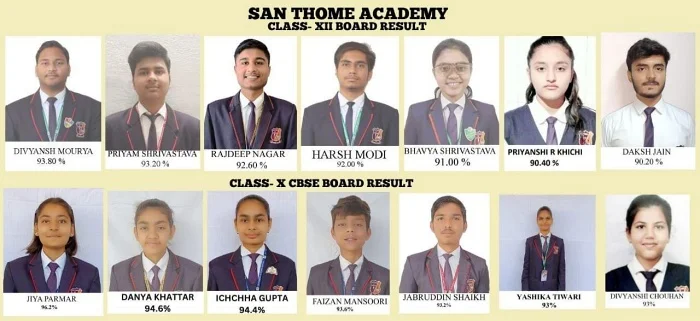 देवास लाइव. सीबीएसई ने 12 मई 2023 को कक्षा दसवीं और बारहवीं बोर्ड परीक्षा परिणाम घोषित किए। प्रतिवर्ष अनुसार सेन थॉम एकेडमी, भोपाल रोड के विद्यार्थियों ने उत्कृष्ट प्रदर्शन दिया। कक्षा बारहवीं से दिव्यांश मौर्य (मानविकी) ने 93.8% के साथ टॉप किया, प्रियम श्रीवास्तव (पीसीएम) ने 93.2%, हर्ष मोदी (पीसीबी) ने 92% और दक्ष जैन (कॉमर्स) ने 90.2% अंक हासिल किए और स्कूल को गौरवान्वित महसूस कराया।